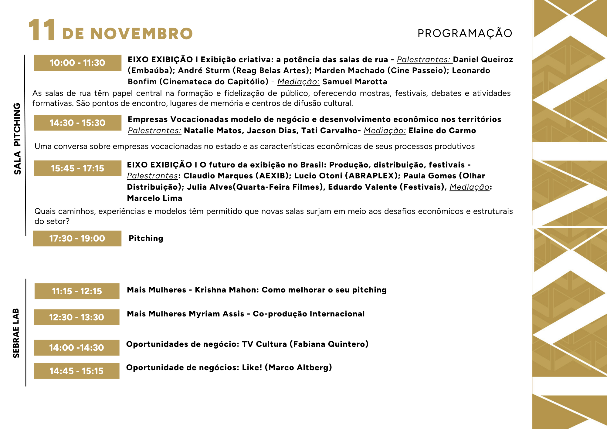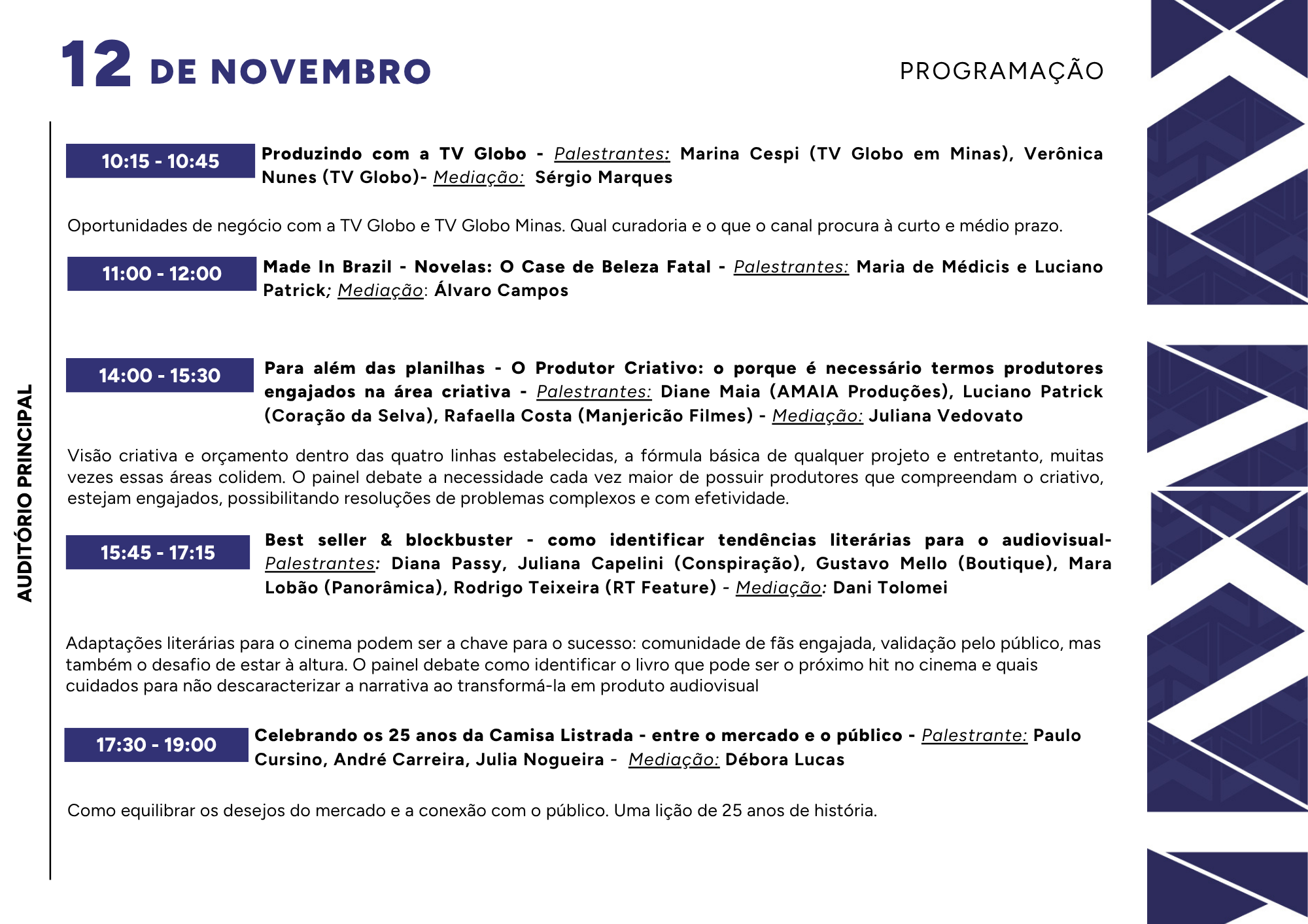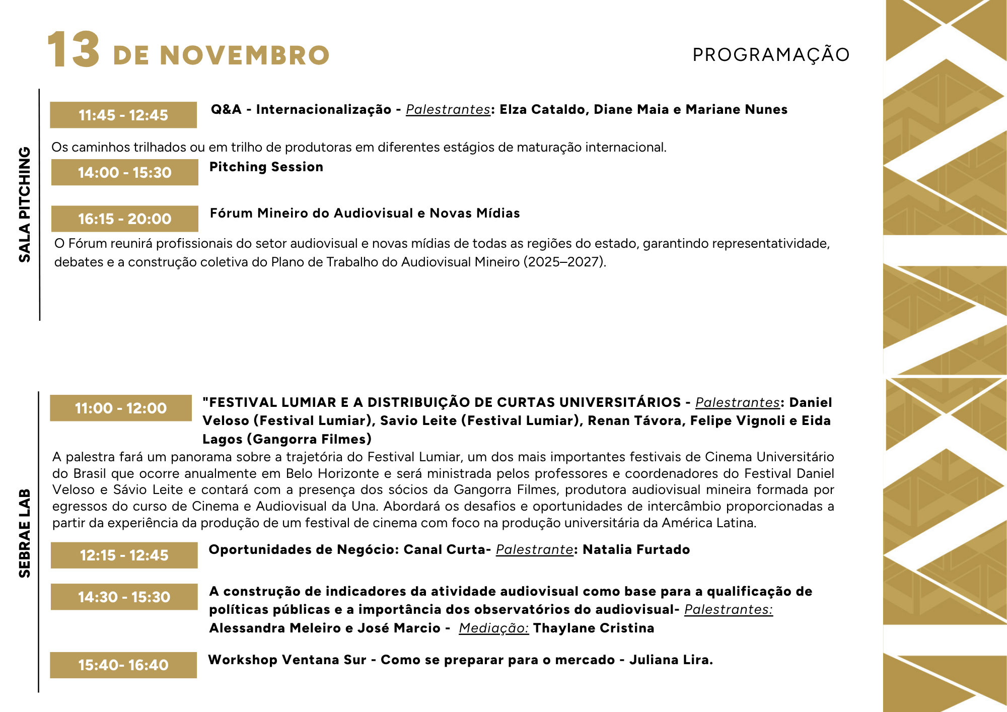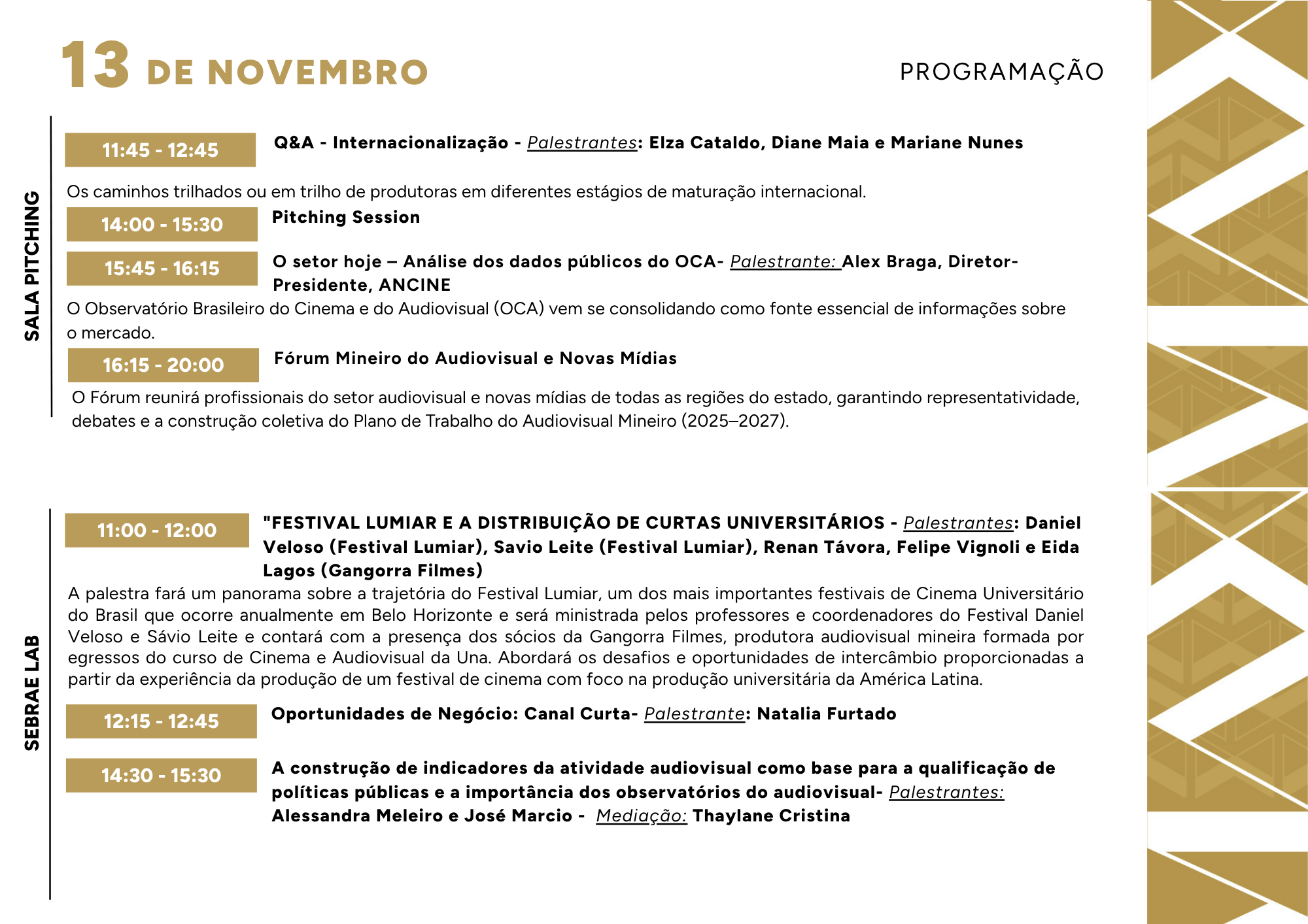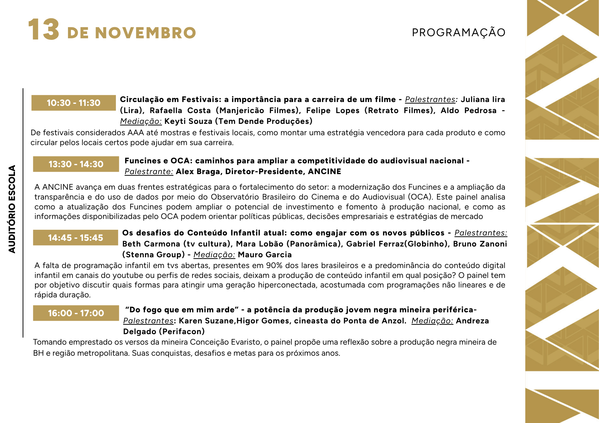 Seus principais pontos fortes são os encontros entre produtores e exibidores, além de debates sobre o futuro do setor, sendo o maior salão de negócios mineiro, inteiramente dedicado à promoção de agentes econômicos da indústria audiovisual.